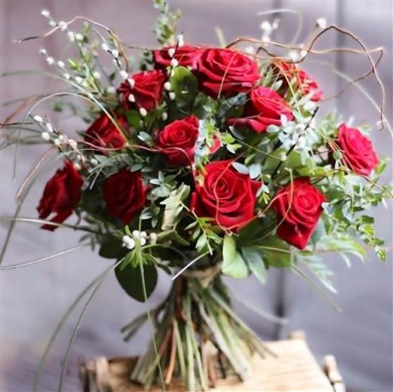 A non traditional bouquet of 12 roses, pussy willow and curly Hazel. Something elegant and simple.