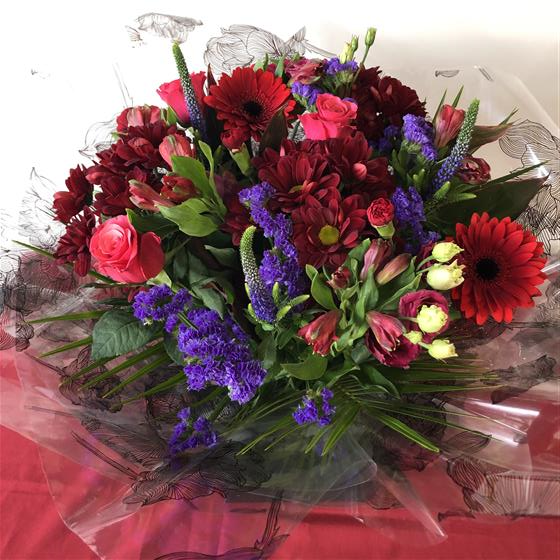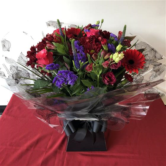 A superb choice for people who enjoy the darker colours. A stunning choice of ruby, purple and burgundy displayed with all black cellophane and living vase.