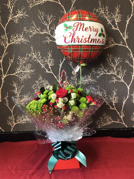 Florist choice of festive flowers displayed in an aqua box and presented with a seasonal balloon.