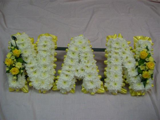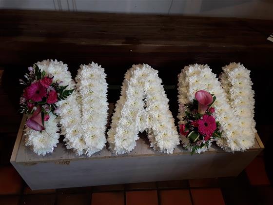 Nan in based white chrysanths, personalised with your choice of ribbon and floral spray corsage.