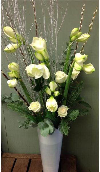 White amaryllis with white roses and foliage of pussy willow, spruce and birch displayed in a glass vase.