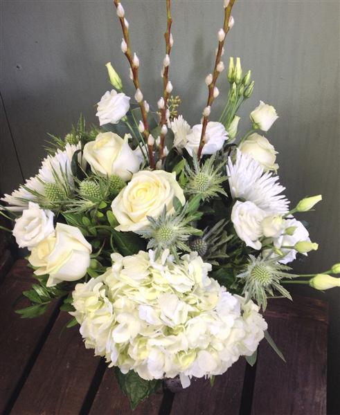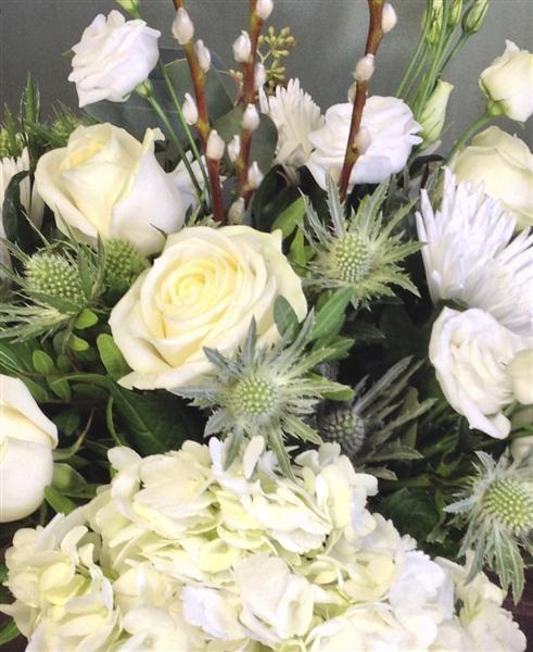 Wintery whites, chrysanthemums, roses and lisianthus help to create this crisp, seasonal bouquet.
